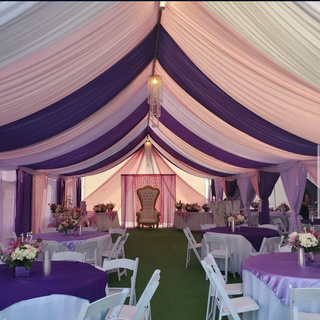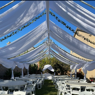 The look of a party tent, no matter the size, can be decorated using drapes, lighting, and accent pieces to match your theme.